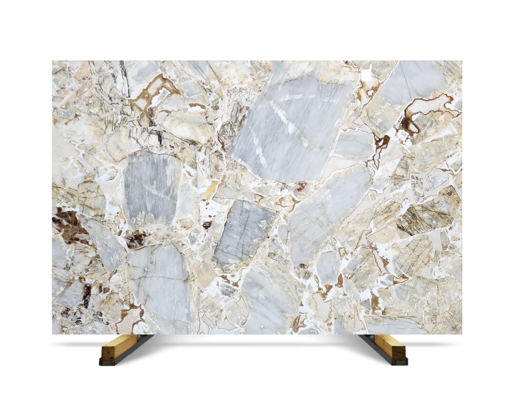 Blue Puzzle marble is characterized by its brecciated formation, where large angular fragments are naturally bonded together over time. The surface combines pale blue, light gray, and soft beige tones, resulting in a balanced and neutral color palette.