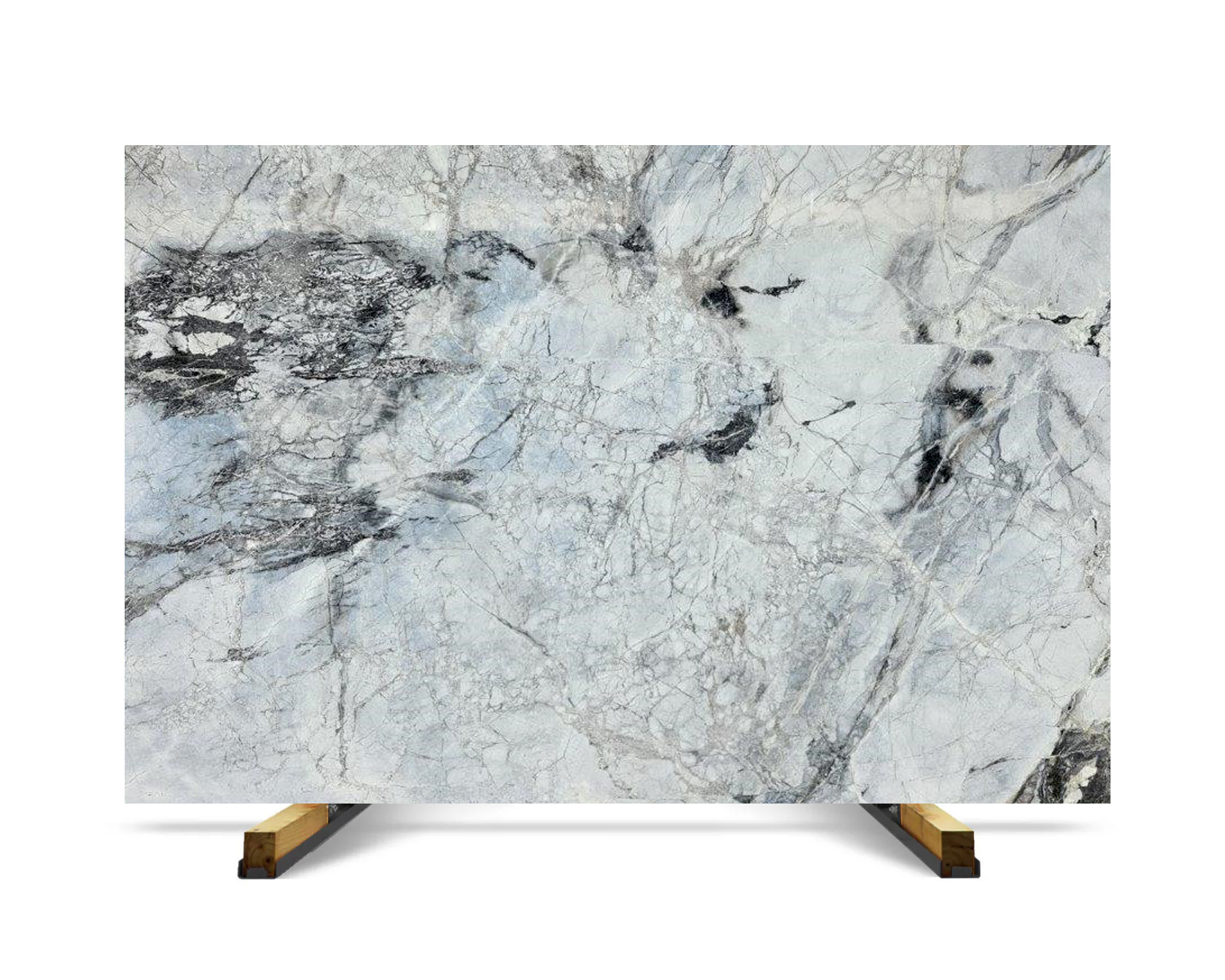 Bluetta marble slabs from Turkey are selected for projects that require strong visual contrast and a natural stone surface with expressive character. This material features a light white to soft gray background combined with bold dark veining and mineral patterns that create a dynamic, high-impact appearance.