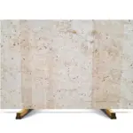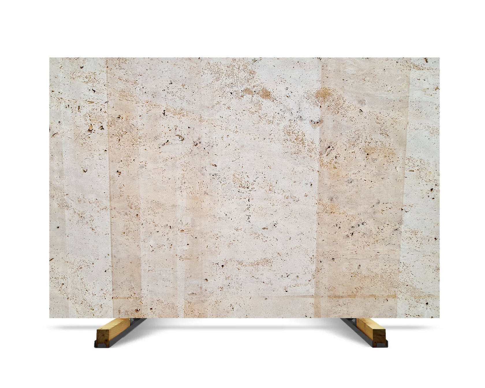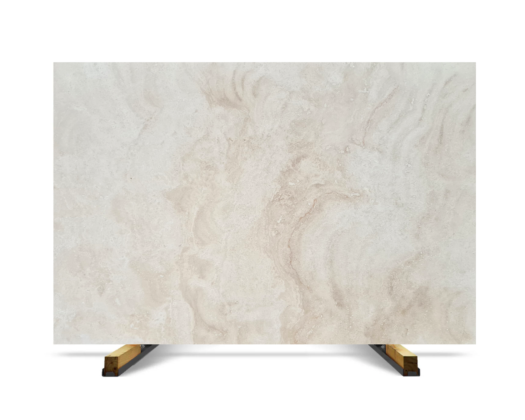 Crosscut Travertine in this selection features a warm beige tone with irregular pore distribution and subtle tonal shifts across the surface. The pattern combines soft background movement with light directional marks from the cutting process.