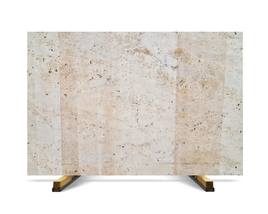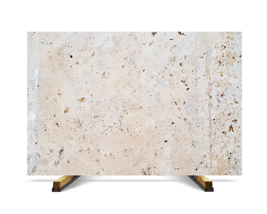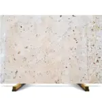 Crosscut travertine from Turkey is supplied to the United States through container-based shipments and volume-oriented sourcing programs. This material is defined by a light beige base with visible natural pores and scattered mineral activity, creating a surface with organic variation rather than a fully uniform pattern.