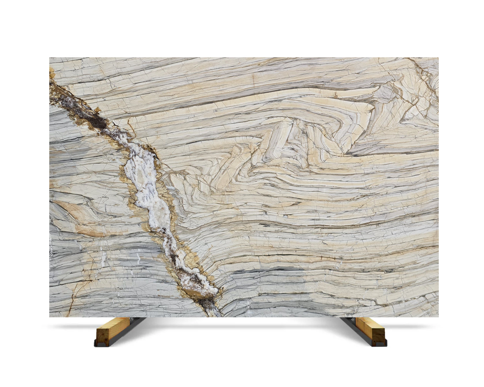The material typically shows a mix of soft beige background tones with gray banding and occasional mineral accents, providing depth without becoming visually overwhelming. Depending on the block selection, the pattern can range from more linear to more dynamic compositions.