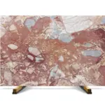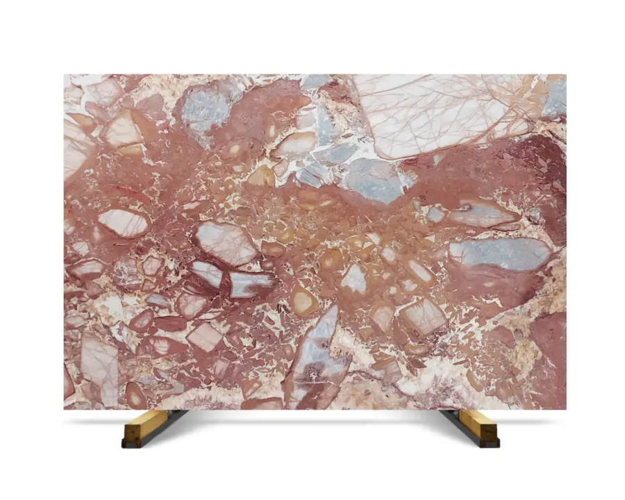 Earth Blue marble from Turkey is supplied to the United States through container-based shipments and project-driven sourcing. This material features a breccia-style structure with warm terracotta tones, grey-blue fragments, and natural stone inclusions that create a highly expressive surface.