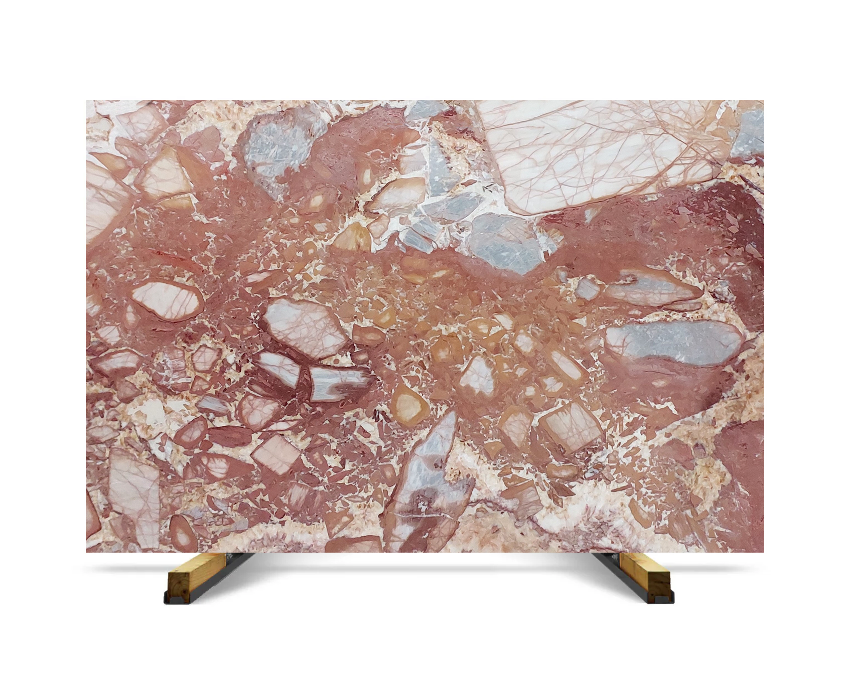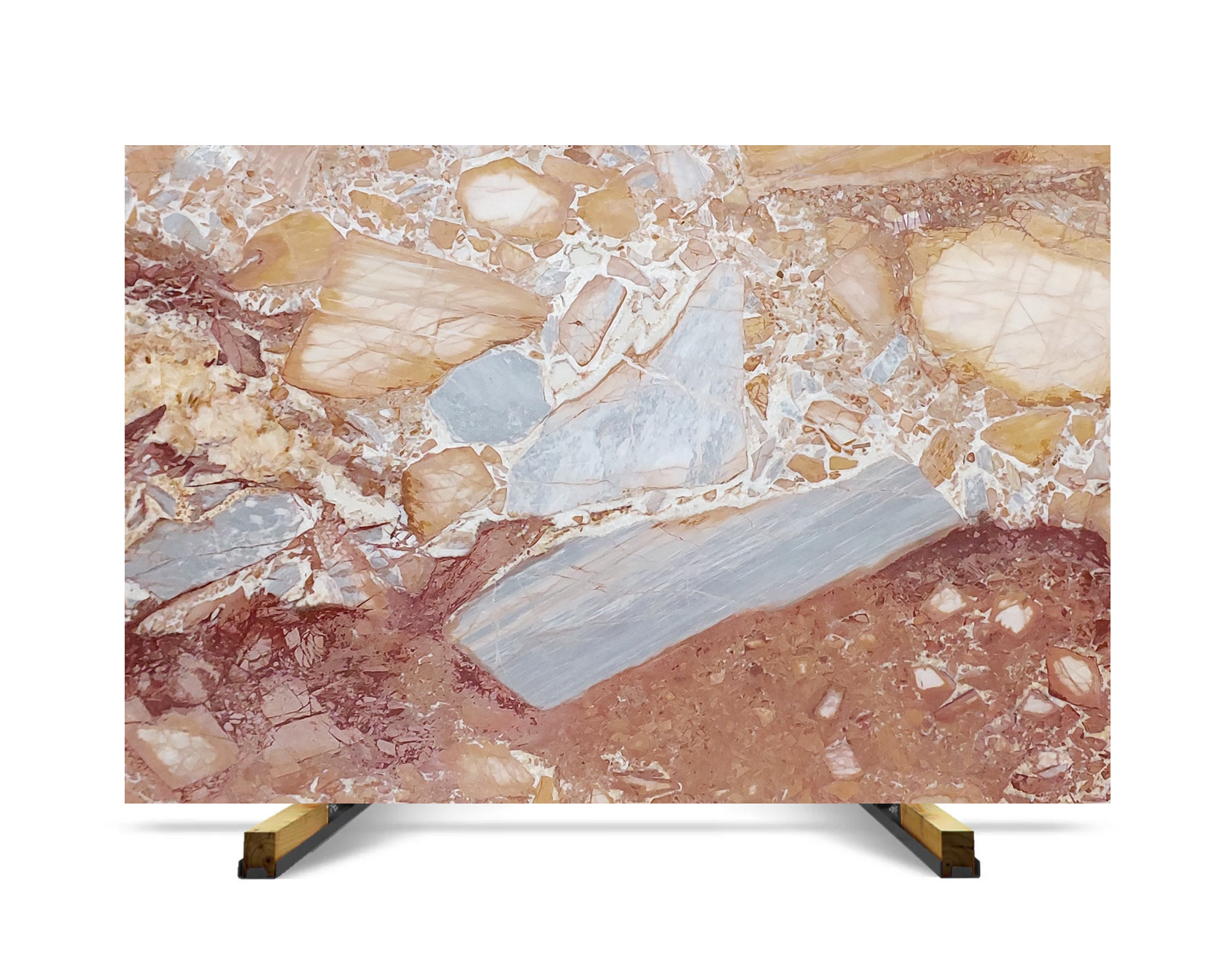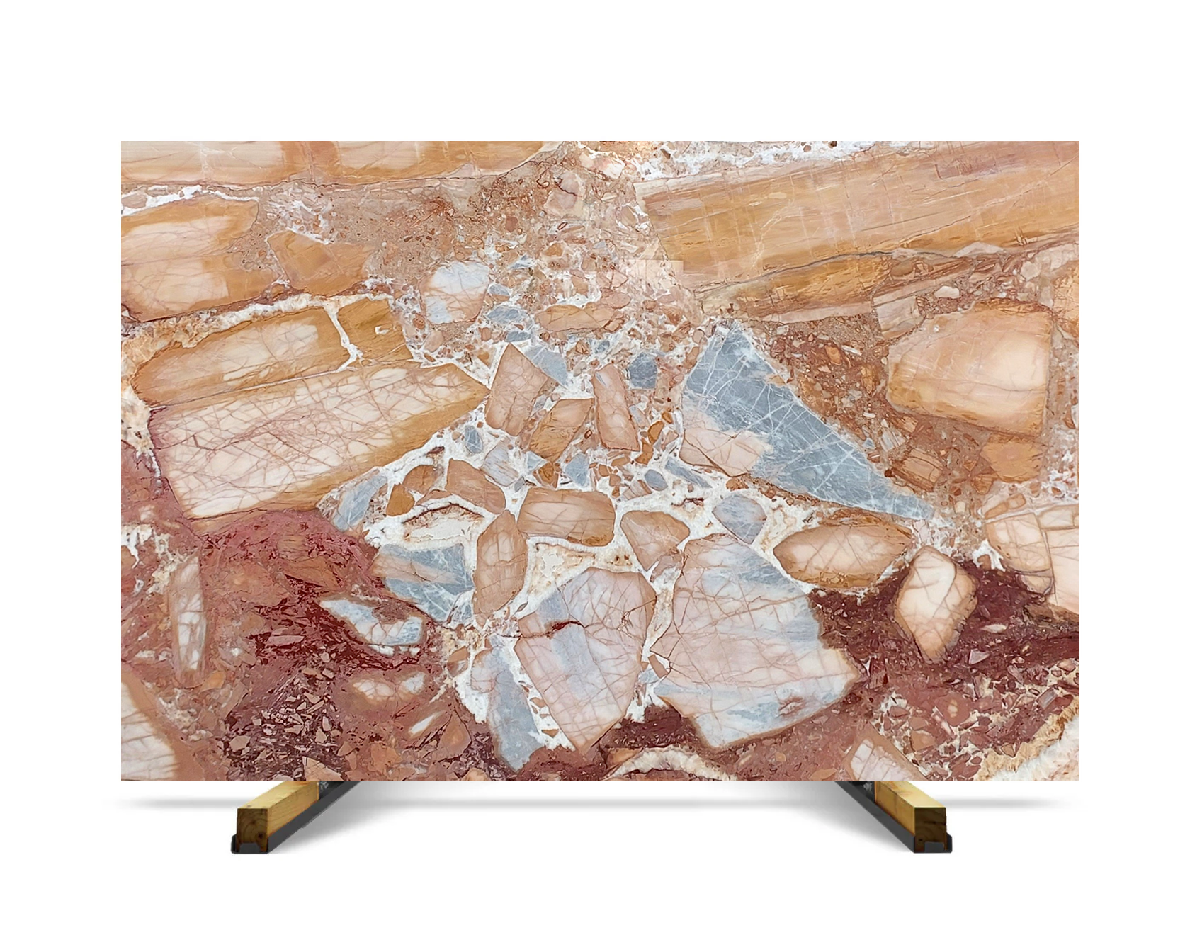 This marble presents a fragmented composition where irregular stone pieces are naturally fused together. The contrast between warm background tones and cooler inclusions creates a layered visual effect with noticeable depth.