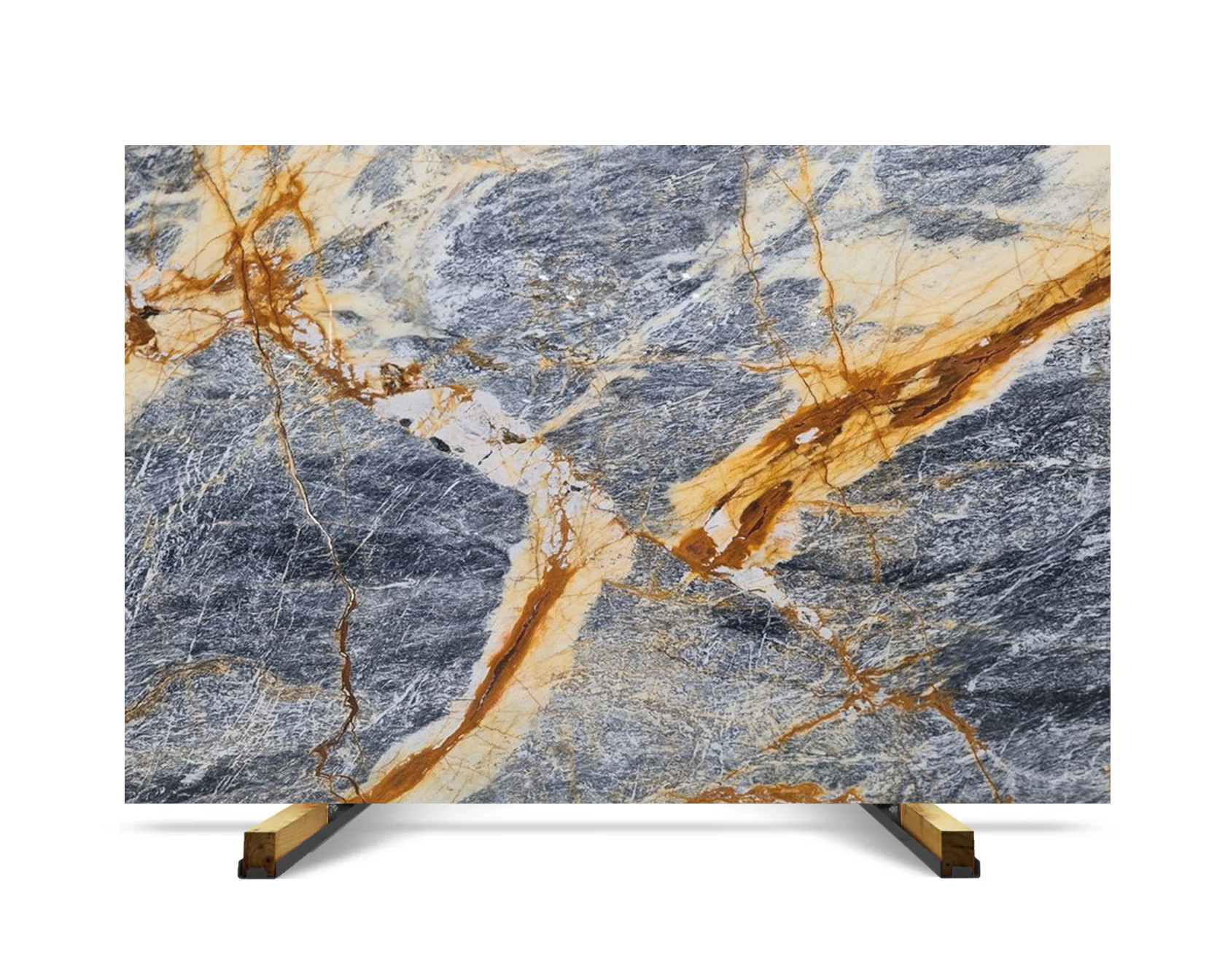 Explosion Blue marble is supplied from Turkey to the U.S. through container-based logistics, offering a bold natural stone with high-contrast composition and architectural presence. The material combines deep grey and blue tones with sharp white structures and warm golden veining.