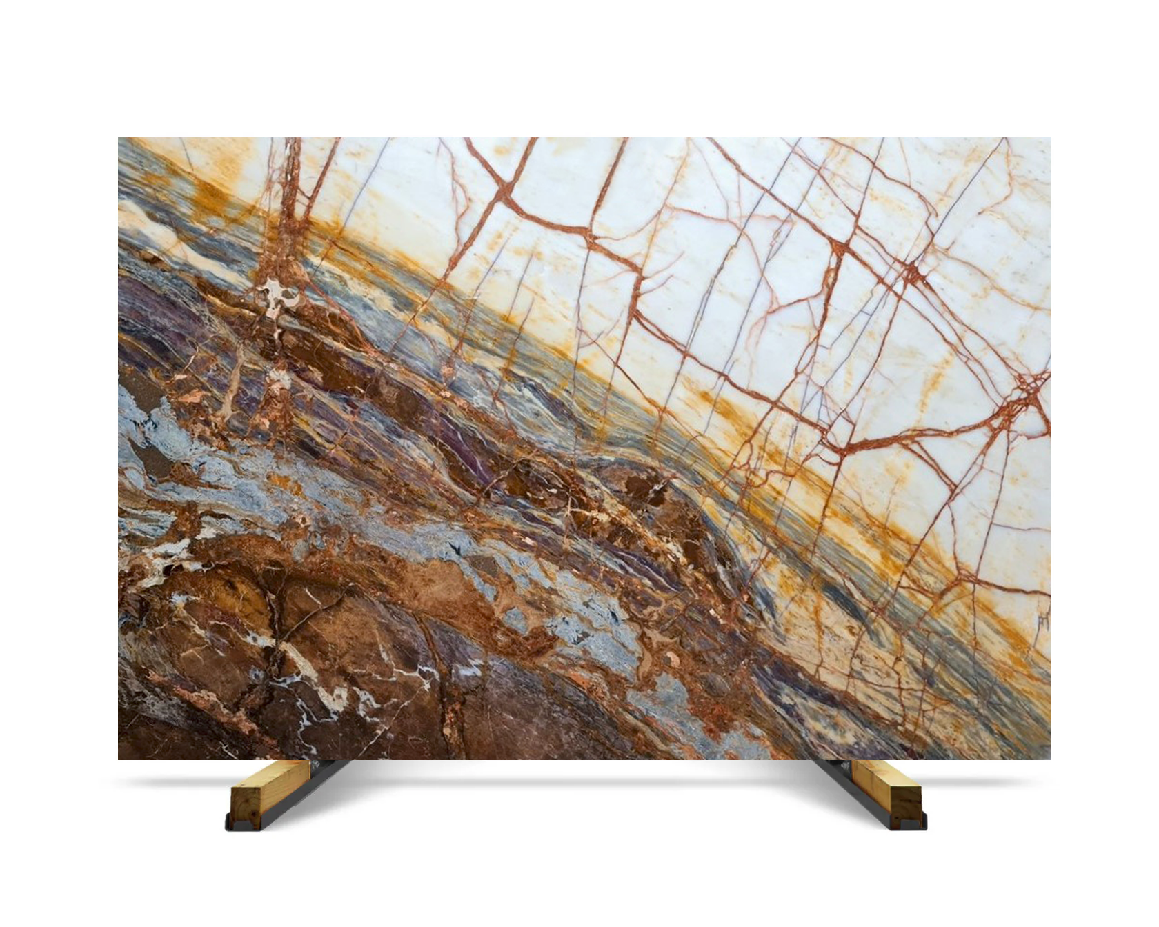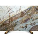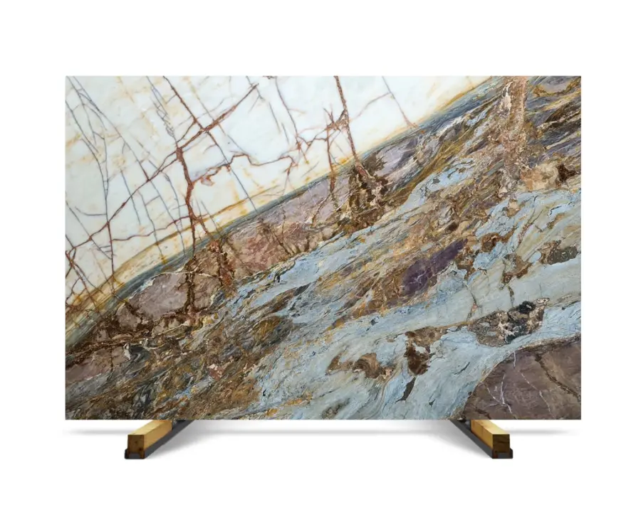 Fusion Blue marble from Turkey is supplied to the United States through container-based shipments and project-driven sourcing programs. This material is defined by its high-contrast composition, combining blue, rust, white, and grey tones with strong directional movement across the slab.