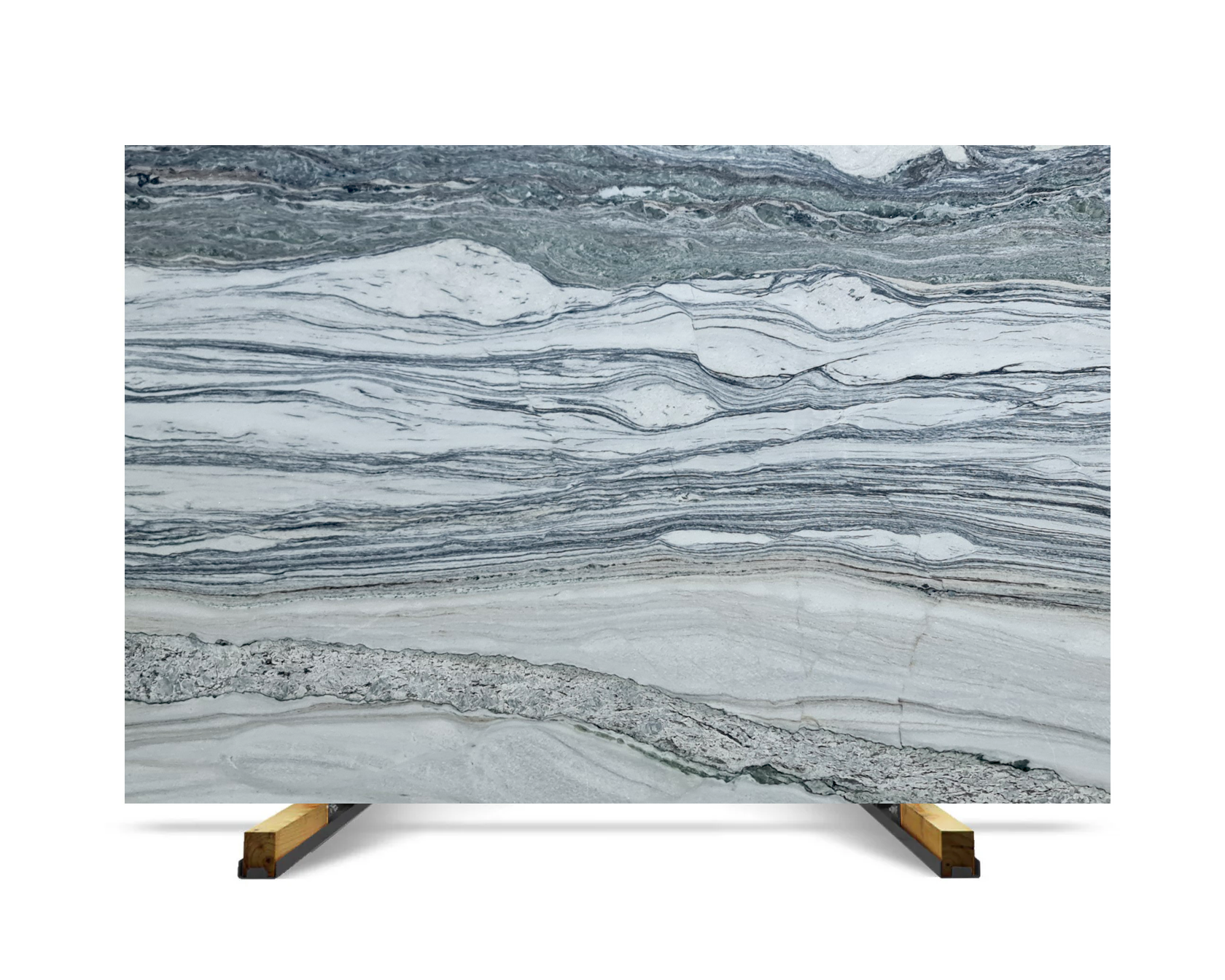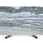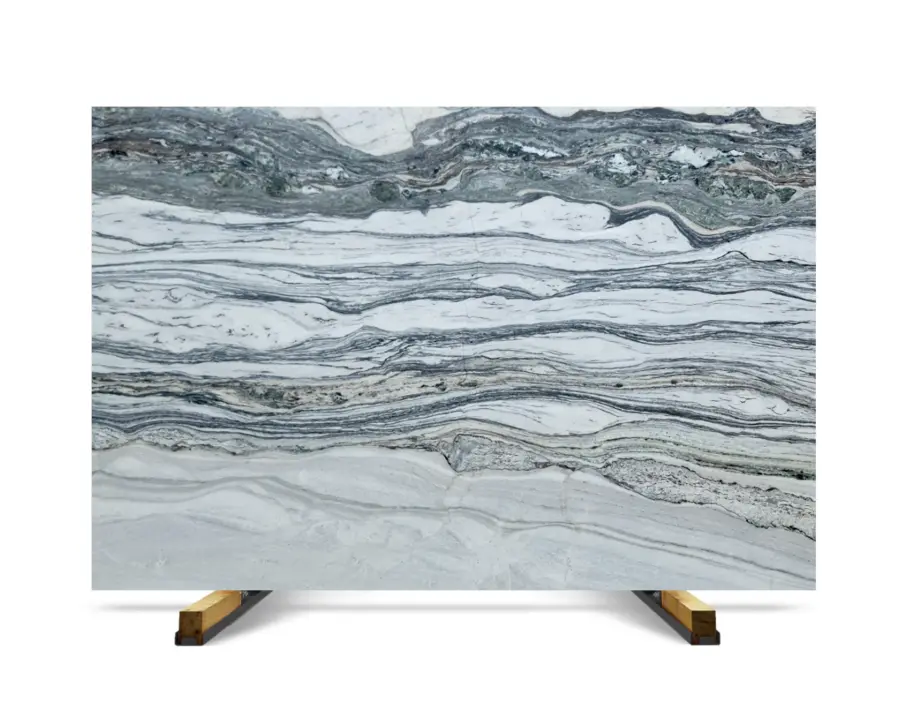Platinium Oasis features horizontal stratification, combining soft grey bands with lighter mineral layers.