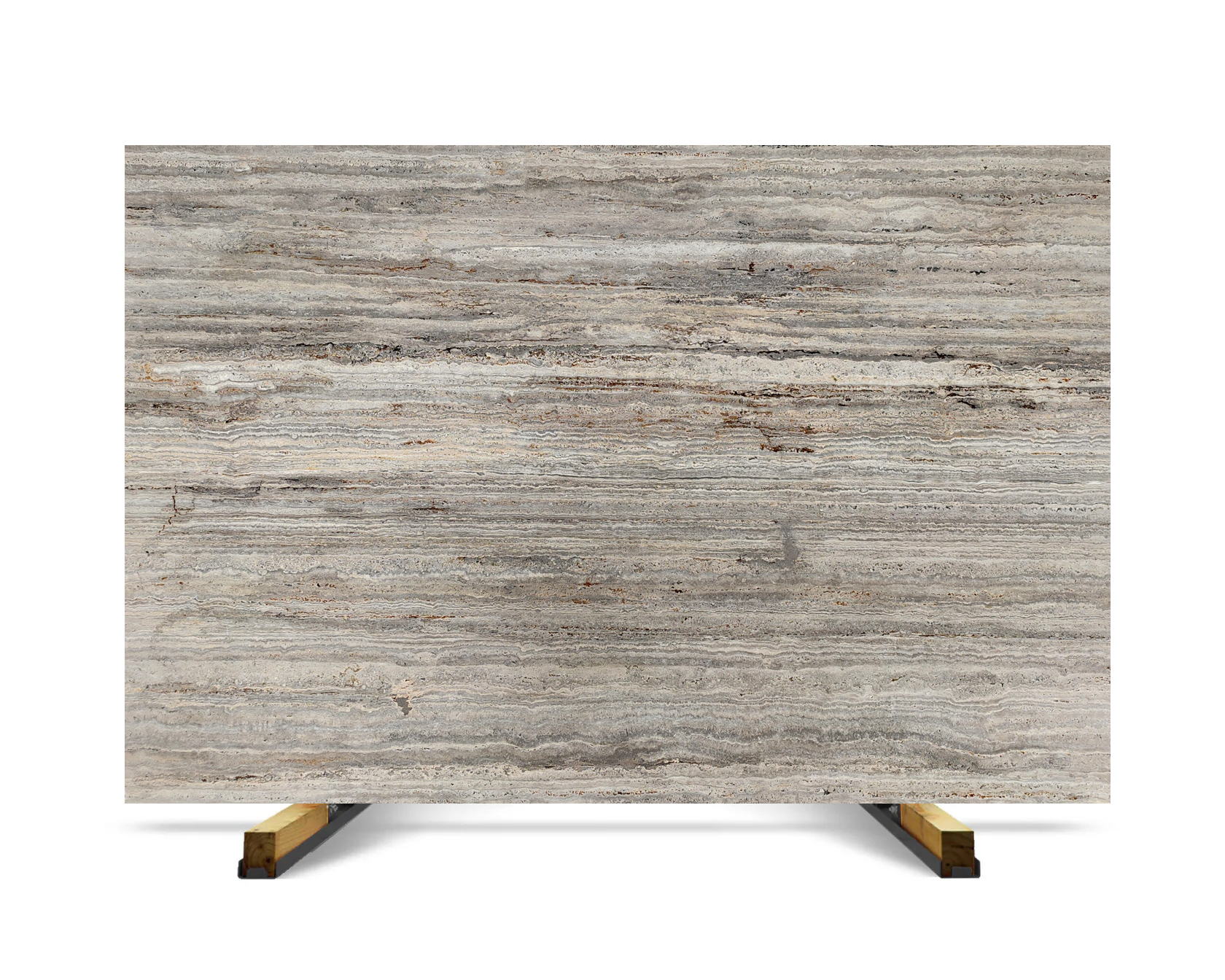 Titanium Travertine features a vein-cut structure with consistent horizontal banding across the slab. The pattern is relatively uniform, with fine tonal variation between layers rather than strong contrast.