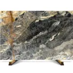 Vincent Black Marble features a bold composition with large-scale movement and fractured veining patterns. The structure includes a mix of dark base zones and lighter mineral intrusions, resulting in a non-uniform and visually dynamic surface.
